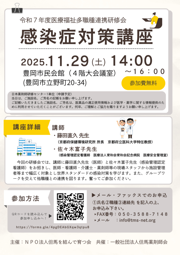 医療・看護・介護・福祉などの現場スタッフから施設管理者等まで幅広い方を対象とした講座となります。講師に、藤田直久先生と佐々木富子先生をお招きし、世界スタンダードの感染症対策を学びます。